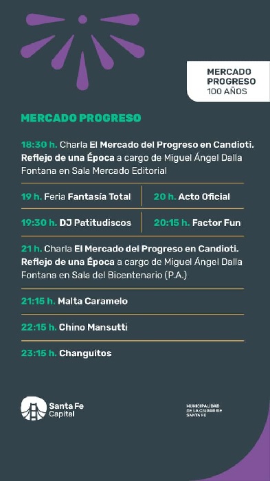 Este sábado 1º de febrero, el Mercado Progreso cumple 100 años y su aniversario será festejado con un evento que no solo incluirá las instalaciones de Balcarce 1635, sino que se desplegará hacia sus alrededores, haciendo al corazón de Barrio Candioti parte fundamental de la conmemoración. La celebración tendrá charlas históricas, ferias, DJs, talleres culturales y shows musicales. Los festejos se desarrollarán en el Mercado Progreso, la Plaza Pueyrredón y los bares aledaños.