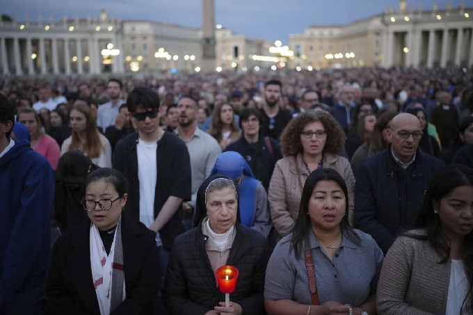 Personas se reunieron en la Plaza de San Pedro esta noche tras la muerte del papa Francisco para honrar su memoria, colocando flores y velas en varios monumentos de la zona.
