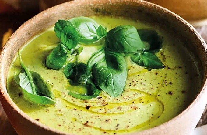 Crema de brócoli al dente con leche de coco y queso fresco batido