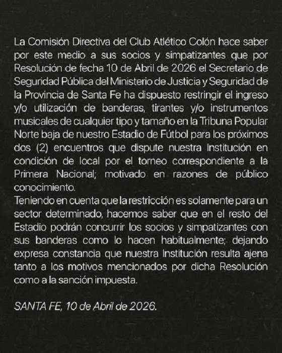 "La Comisión Directiva del Club Atlético Colón hace saber por este medio a sus socios y simpatizantes que por Resolución de fecha 10 de Abril de 2026 el Secretario de Seguridad Pública del Ministerio de Justicia y Seguridad de la Provincia de Santa Fe ha dispuesto restringir el ingreso y/o utilización de banderas, tirantes y/o instrumentos musicales de cualquier tipo y tamaño en la Tribuna Popular Norte baja de nuestro Estadio de Fútbol para los próximos dos (2) encuentros que dispute nuestra Institución en condición de local por el torneo correspondiente a la Primera Nacional; motivado en razones de público conocimiento.