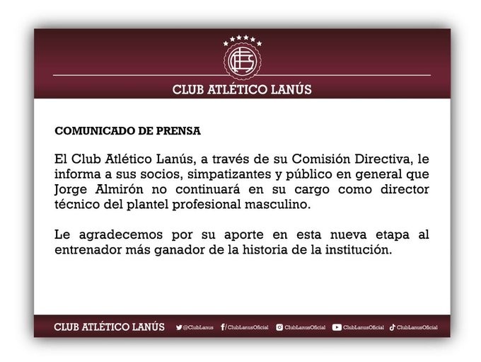 A todo esto, la institución lo oficializó a través de un comunicado por medio de su cuenta en la red social Twitter: "El Club Atlético Lanús, a través de su Comisión Directiva, le informa a sus socios, simpatizantes y al público en general que Jorge Almirón no continuará en su cargo no continuará en su cargo de director técnico del plantel profesional masculino".