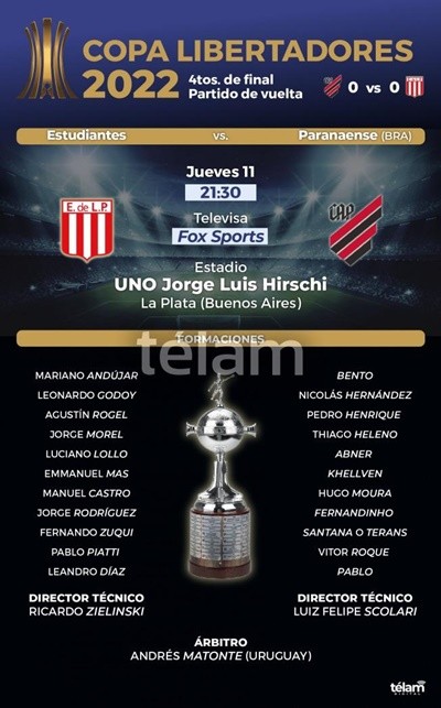 Estudiantes de La Plata se jugará gran parte de la temporada cuando mañana intente concretar su clasificación a las semifinales de la Copa Libertadores de América enfrentando a Athletico Paranaense, de Brasil, en el encuentro desquite de cuartos de final