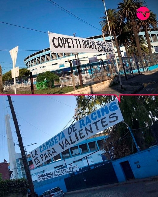 "La camiseta de Racing es para valientes", "Jugadores, cuerpo técnico, mediocres, pechos fríos" y "Los cobardes no hacen la historia" fueron los tres pasacalles que aparecieron colgados sobre el pasaje Oreste Omar Corbatta.