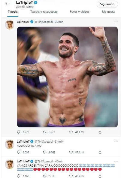 En menos de una hora, la foto de Rodrigo de Paul que publicó Tini Stoessel en su Twitter ser viralizó y revolucionó la red, con más de 3 mil retweets, 1.800 tweets citados y más de 63 mil me gusta, en menos de una hora.