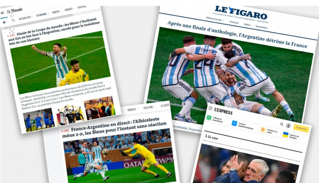 En la nación subcampeona, Le Monde publicó: “Final del Mundial: los Blues pierden por penales ante Argentina, coronada por tercera vez en su historia”. Le Figaro, en tanto, escribieron: “Golpeado por la Albiceleste de Messi, los Blues dejaron escapar su título planetario”.