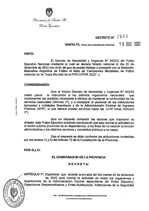 El Gobierno de la Provincia de Santa Fe comunica que en todo el ámbito del Sector Público Provincial, será normal la actividad el día 20 de Diciembre de 2022