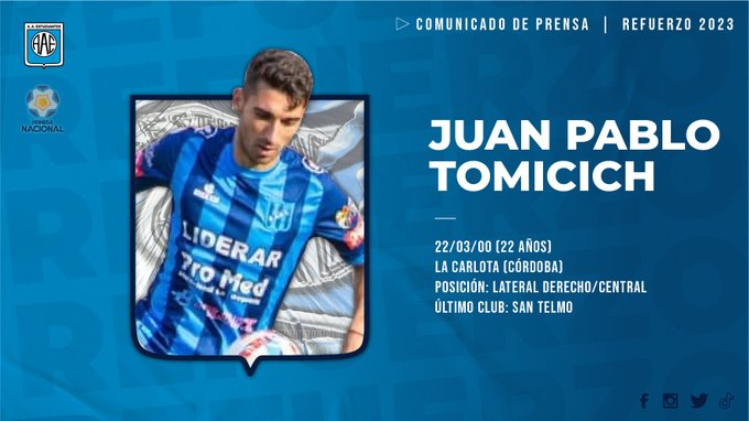 Estudiantes de Río Cuarto sumó en las últimas horas un nuevo refuerzo con miras a la participación en el certamen de la Primera Nacional con el arribo del lateral derecho Juan Pablo Tomicich.