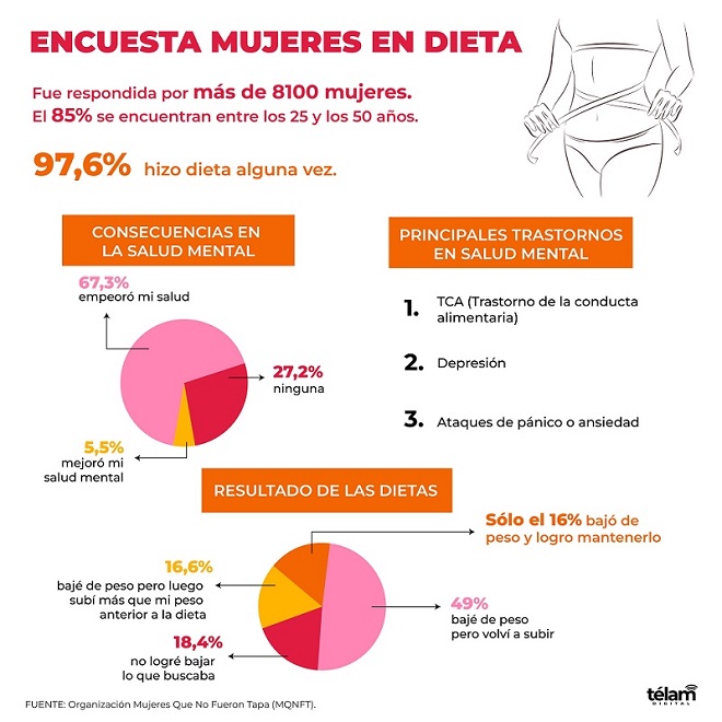 En el marco de la campaña #HermanaSoltáLaPanza, Mujeres que no fueron tapa (MQNFT) hizo una encuesta sobre los motivos y el efecto de las dietas para adelgazar en la vida de las mujeres. El 97,6% aseguró que se sometió al menos a una dieta para bajar de peso; el 88,7% respondió que alguna vez le dijeron que tenía que adelgazar, y en el 30,1% de los casos, fue la madre la primera persona en recomendar el inicio de algún régimen alimenticio.