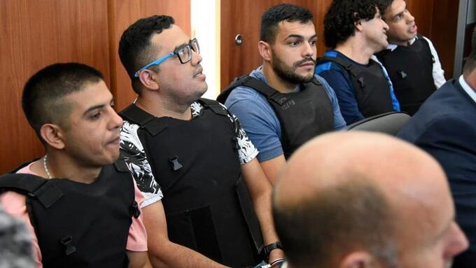 Ariel “Guille” Cantero y su padre Ariel, “el Viejo” (segundo y cuarto respectivamente, de izquierda a derecha), en el juicio donde el 27 de abril de 2018 recibieron condenas como organizadores de la banda de Los Monos. Télam