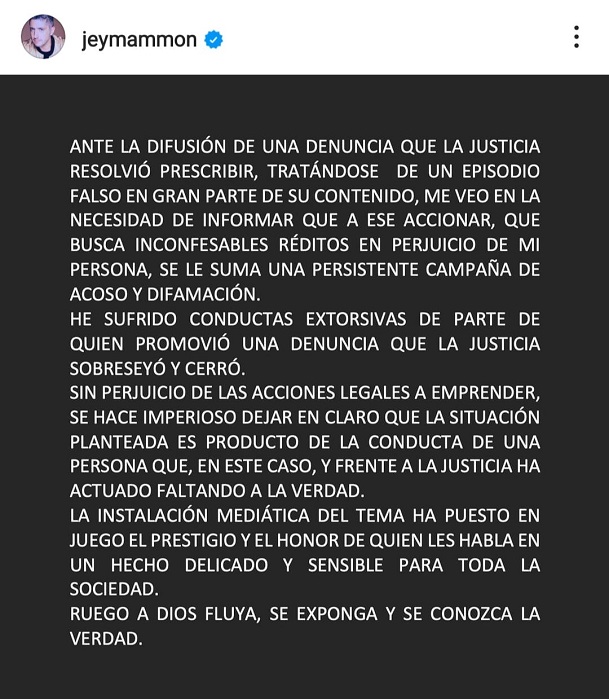 El comunicado oficial dice: "A partir de la información de público conocimiento, Telefe acordó con Jey Mammón suspender momentáneamente su continuidad como conductor de La Peña de Morfi, concediéndole el tiempo que considere necesario para ordenar situaciones de índole personal".