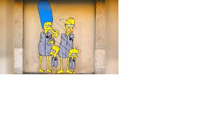 En el mural, pintado en la fachada del Memorial, aparecen los cinco miembros de la famosa familia de dibujos animados de la televisión -Homero, Marge, Lisa, Bart y la bebita Maggie- vestidos con las camisas de rayas con las que identificaban a los deportados a los campos de exterminio nazis.