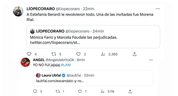 “Faltan muchas cosas que decir. Están investigando las cámaras perooooo nadie dice otro nombre. Le robaron durante el programa #LAM en #AmericaTV. Mónica Farro y Marcela Feudale las perjudicadas. A Estefanía Berardi le revolvieron todo. Una de las invitadas fue Morena Rial”, señaló Lío Pecoraro.