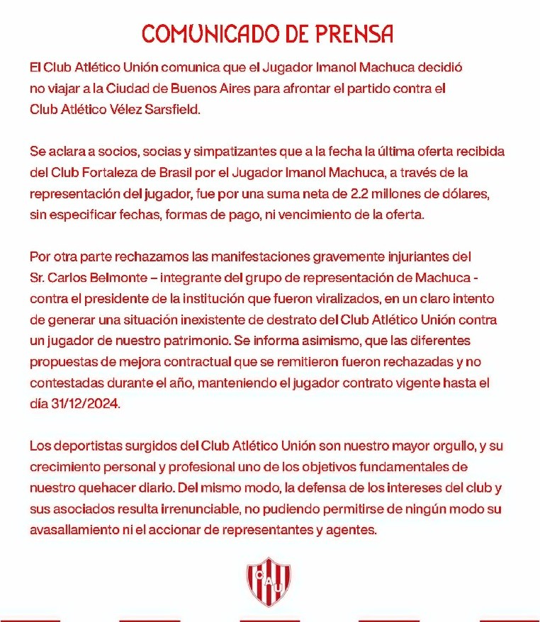 MACHUCA SE DECLARO EN REBELDIA Y NO VIAJO, AL PARTIDO CON VELEZ, EL DURO COMUNICADO