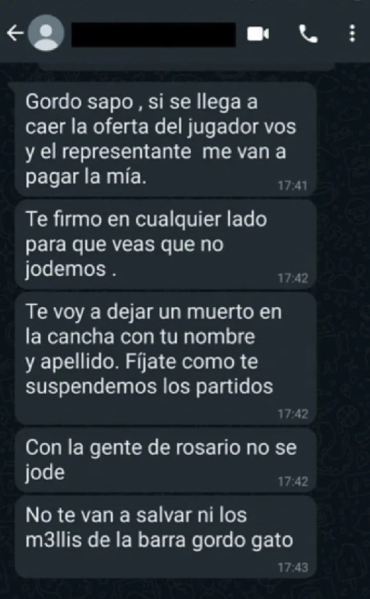 En este contexto, Luis Spahn fue amenazado de muerte. "Gordo sapo, si se llega a caer la oferta del jugador vos y el representante me van a pagar la mía. Te firmo en cualquier lado para que veas que no jodemos", sentenció el agresor desde un número anónimo.