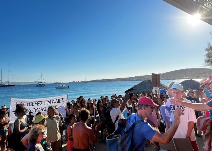 "Venimos aquí pacíficamente... solo queremos que sepan que estamos tratando de reclamar nuestro derecho al libre acceso a nuestras playas", dijo uno de los manifestantes a través de un altavoz mientras caminaba entre las tumbonas de la playa de Marcello en Paros.