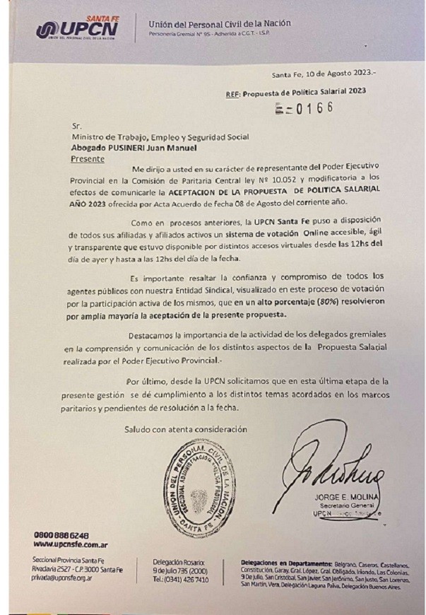 Ante la propuesta de política salarial de agosto a diciembre de 2023 del Poder Ejecutivo para los empleados públicos de la administración central, la UPCN Santa Fe puso a disposición de todos las afiliadas y afiliados activos pertenecientes al Convenio Ley 10.052 un proceso de votación mediante la página web institucional cómo ya es costumbre.