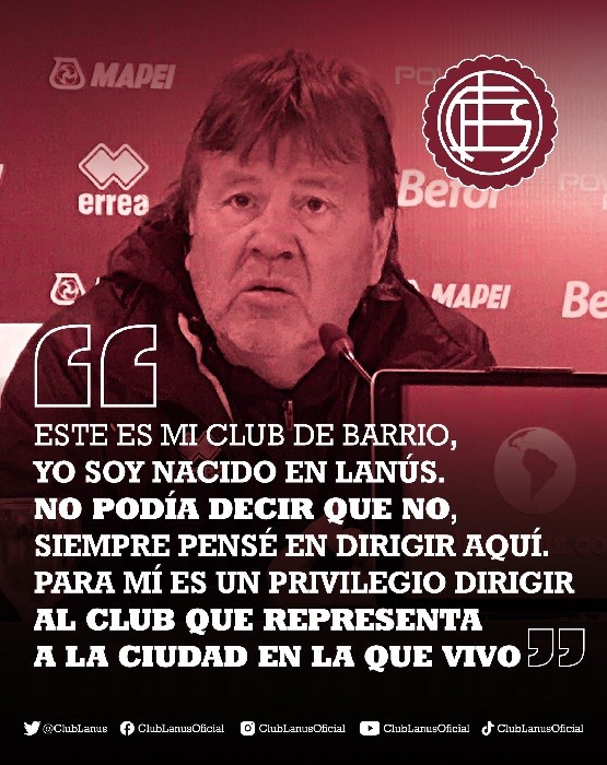 Finalmente, Respecto de por qué aceptó dirigir al "Granate", el entrenador explicó que "nací en Lanús, vivo acá, es el club del barrio en el que nací y viví, y siempre pensé que en algún momento iba a dirigir el club del barrio que me representa".