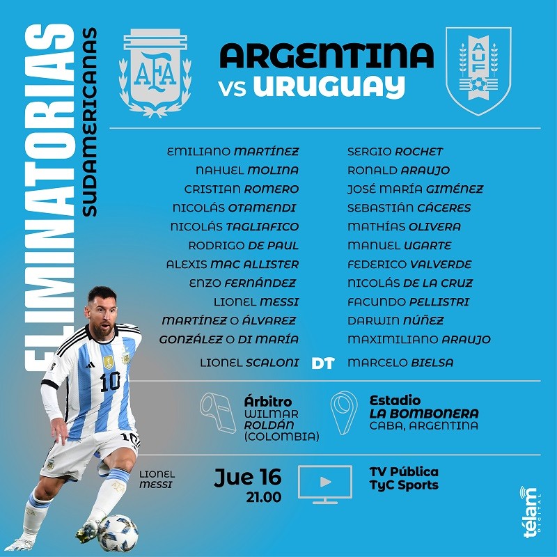 El seleccionado argentino, líder con puntaje ideal de las Eliminatorias sudamericanas para el Mundial 2026, recibirá en La Bombonera a su par de Uruguay, dirigido por Marcelo Bielsa, por la quinta fecha.