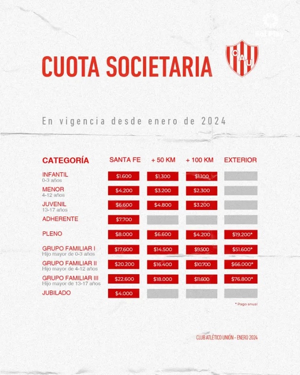 Por otro lado aumento la cuota social del club con estos valores