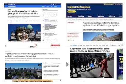 Este miércoles 24 de enero se realizó en todo el país el primer paro nacional contra el gobierno de Javier Milei por el DNU y la ley ómnibus. La mayoría de los medios internacionales destacaron en sus portales los reclamos de los distintos gremios para realizar esta medida de fuerza.