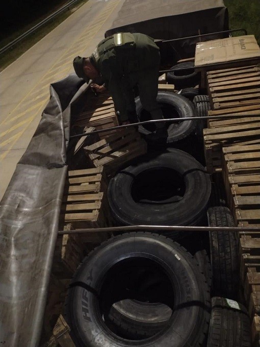 Al proceder a la inspección del rodado, los agentes federales descubrieron, escondidos entre cajones de madera, 50 neumáticos de diferentes rodados sin aval legal, en violación al Codigo Aduanero.