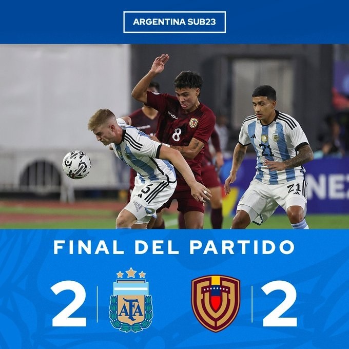 El seleccionado argentino Sub '23 de fútbol que conduce Javier Mascherano empató esta noche 2-2 con su par local de Venezuela, en uno de los partidos inaugurales del cuadrangular final del Preolímpico que se desarrolla en Caracas y que clasificará a dos equipos para los Juegos Olímpicos París 2024.