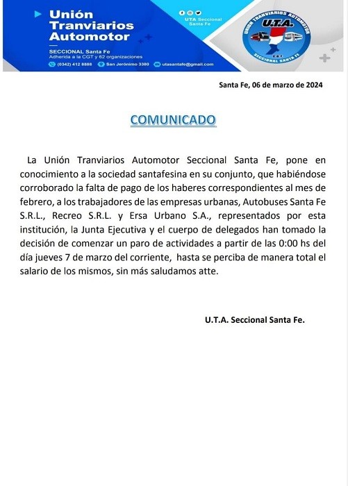 PESE A LAS PROMESAS DE AUMENTOS DEL BOLETO LOS EMPRESARIOS NO DEPOSITARON Y UTA EMITIO ESTE COMUNICADO
