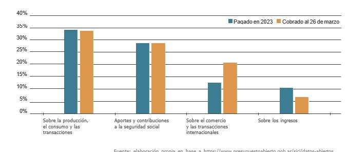 Según surge del trabajo, el 54.4% de los ingresos públicos proviene de impuestos sobre la producción, el consumo, las transacciones y el comercio exterior (retenciones a las exportaciones e impuestos a las importaciones como el PAIS). Se trata de una cifra mucho mayor a la que se recaudó, por ejemplo, en ganancias, que apenas llega al 7% y también por aportes en seguridad social, en torno al 28,6%.
