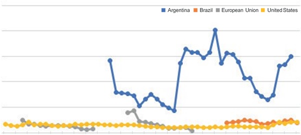 Es importante observar la particularidad del caso argenti- no. En el gráfico 3 se presenta el peso de los impuestos sobre el comercio exterior en diferentes países de referen- cia y sólo en Argentina este impuesto tiene un peso extraordinario en la composición de los ingresos públicos, incluso ello se puede extender a cualquier comparación internacional. A fin de tomar dimensión del problema, Argentina sólo es superada en este indicador por los siguientes países con mediciones recientes: Namibia, Filipi- nas, Sri Lanka, Cote d'Ivoire, Islas Salomón, Botswana, Nepal, Bahamas, Guinea-Bissau, Somalia, Ethiopia, St. Vincent and the Grenadines, Burundi, Kazakhstan, Togo, Republica Africana Central y Sudán.