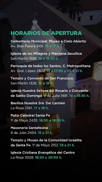 Los puntos serán 10 dentro de tres recorridos: del Sur; del Centro; y el Cementerio Municipal. Los edificios comprendidos son: Templo y Museo de la Comunidad Israelita; Masonería Santafesina; Iglesia Cristiana Evangélica (La Rioja 3021); Patio Catedral e Iglesia Sagrado Corazón; Basílica Nuestra Sra. del Carmen; Iglesia de los Milagros y manzana jesuítica; Iglesia de Todos los Santos Catedral Metropolitana; Templo y Convento de San Francisco; Iglesia Nuestra Sra. del Rosario y Convento Santo Domingo.