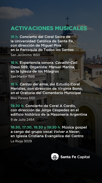 Los tres mencionados anteriormente sucederán desde las 16 horas; mientras que a las 19.30 está la presentación del Coral A Cordis, bajo la dirección de Jorge Céspedes, en la Masonería Santafesina; y a las 16.30, 17.30, 18.30, 19.30 y 20.15 se llevará a cabo la actuación del grupo vocal Volver a Nacer, música gospel, en la Iglesia Cristiana Evangélica (La Rioja 3021).