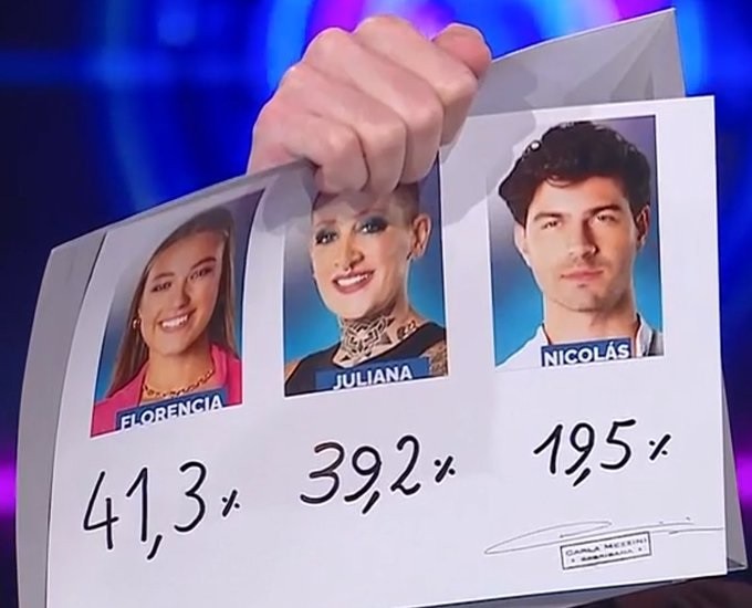 — Facu Verón (@Faacuveron) June 3, 2024 >“Por decisión del supremo, quien deja la competencia y abandona la casa ya misma es… Florencia”, anunció Santiago del Moro.La reacción de Flor fue asentir con la cabeza y aplaudir, mientras que Juliana, alias “Furia” gritaba “gracias” de manera descabellada rumbo a la habitación en compañía de Agos.