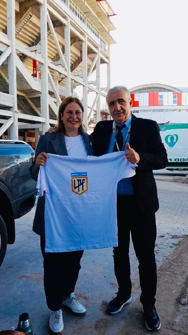 Antes del comienzo del encuentro la autoridad provincial fue recibida por Ariel Sclafani, integrante de la Liga Profesional, quien le obsequió una camiseta con el logo del torneo.