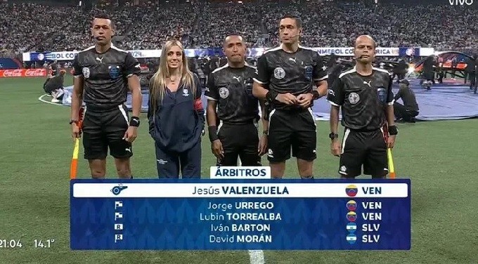 Así, la columnista de F90 estaba junto al árbitro Jesús Valenzuela; los jueces de línea Jorge Urrego y Lubin Torrealba; y los asistentes Iván Barton y David Morán. Sonriente, vestida de azul con un conjunto oficial de la Copa América, Morena sonrió mientras la cámara la filmaba.